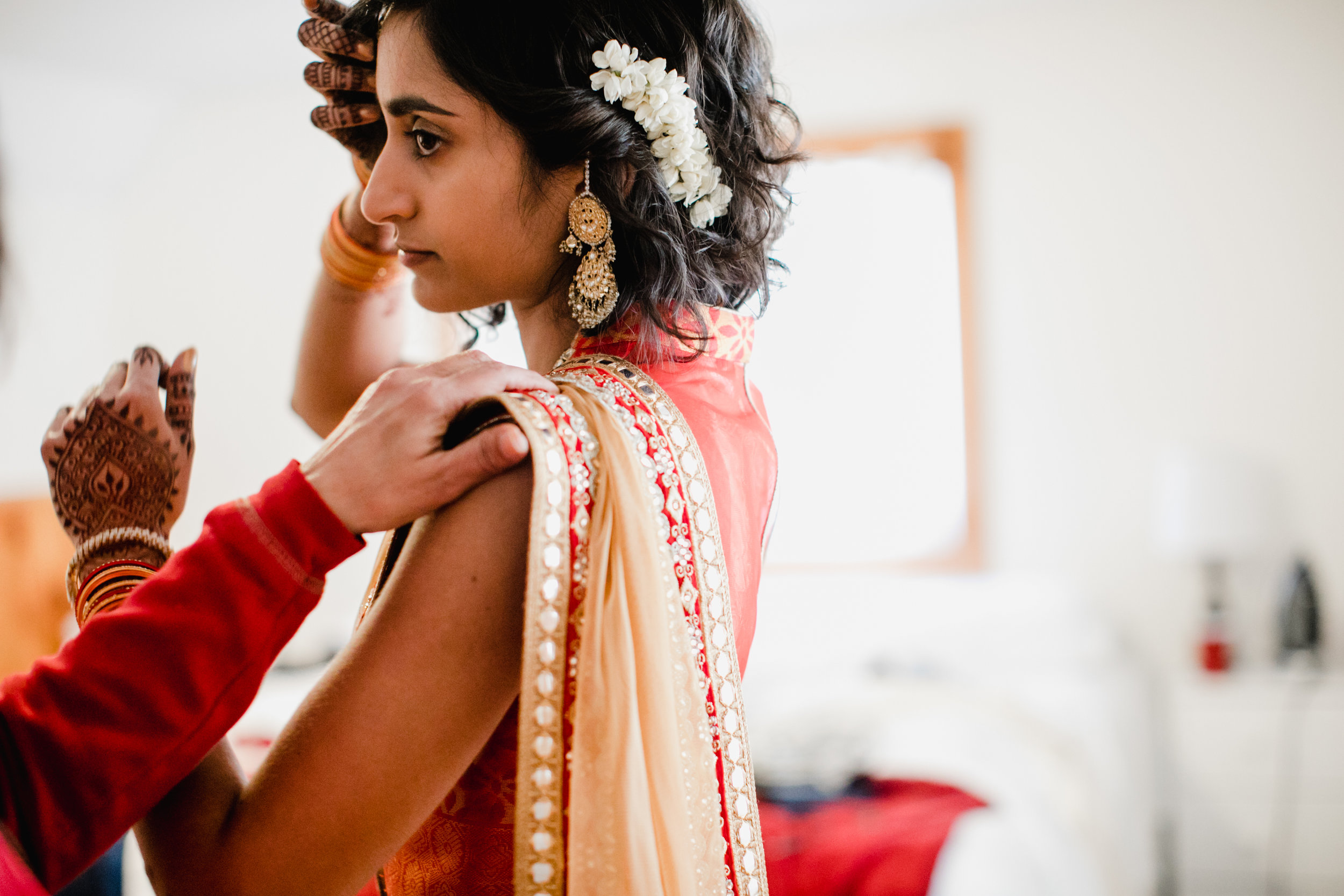 Traditionally, the groom enters the wedding atop an elephant, called at Baraat. In lieu of an elephant, though, Jonathan proceeded in a VW, equipped with paper-mache ears, eyes and trunk! Even though there wasn't many leaves on the trees up in the mountains, their day was filled with color and liveliness. We love how Monica's dress really stands out in all of their photos!